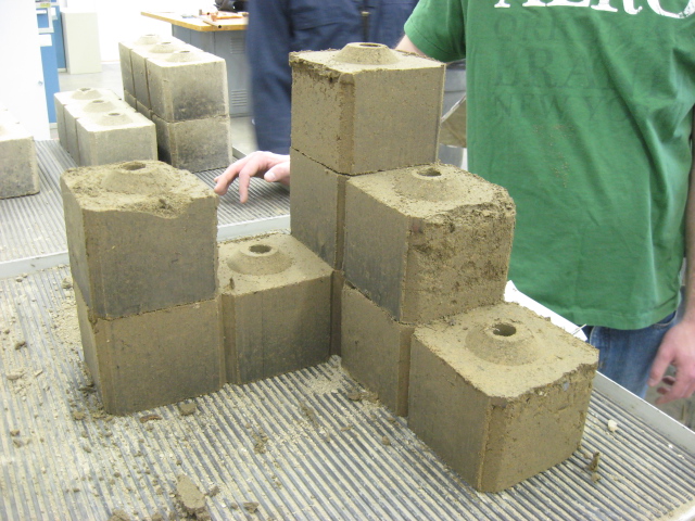 The block-making process is simple. First, you fill the press with a mixture of clay, sand, water, and cement powder (2-5% weight), slam the lid down and compress it.