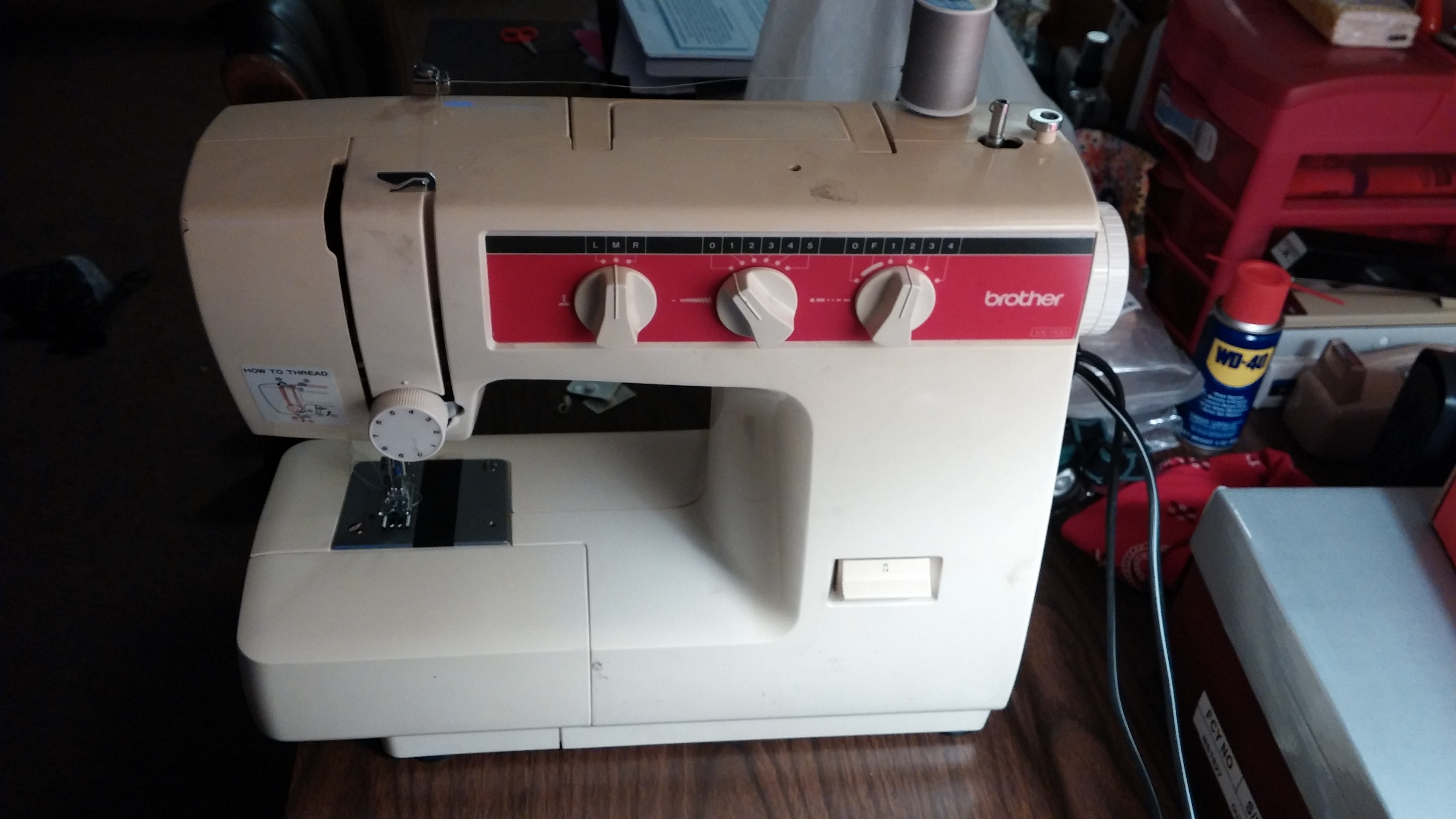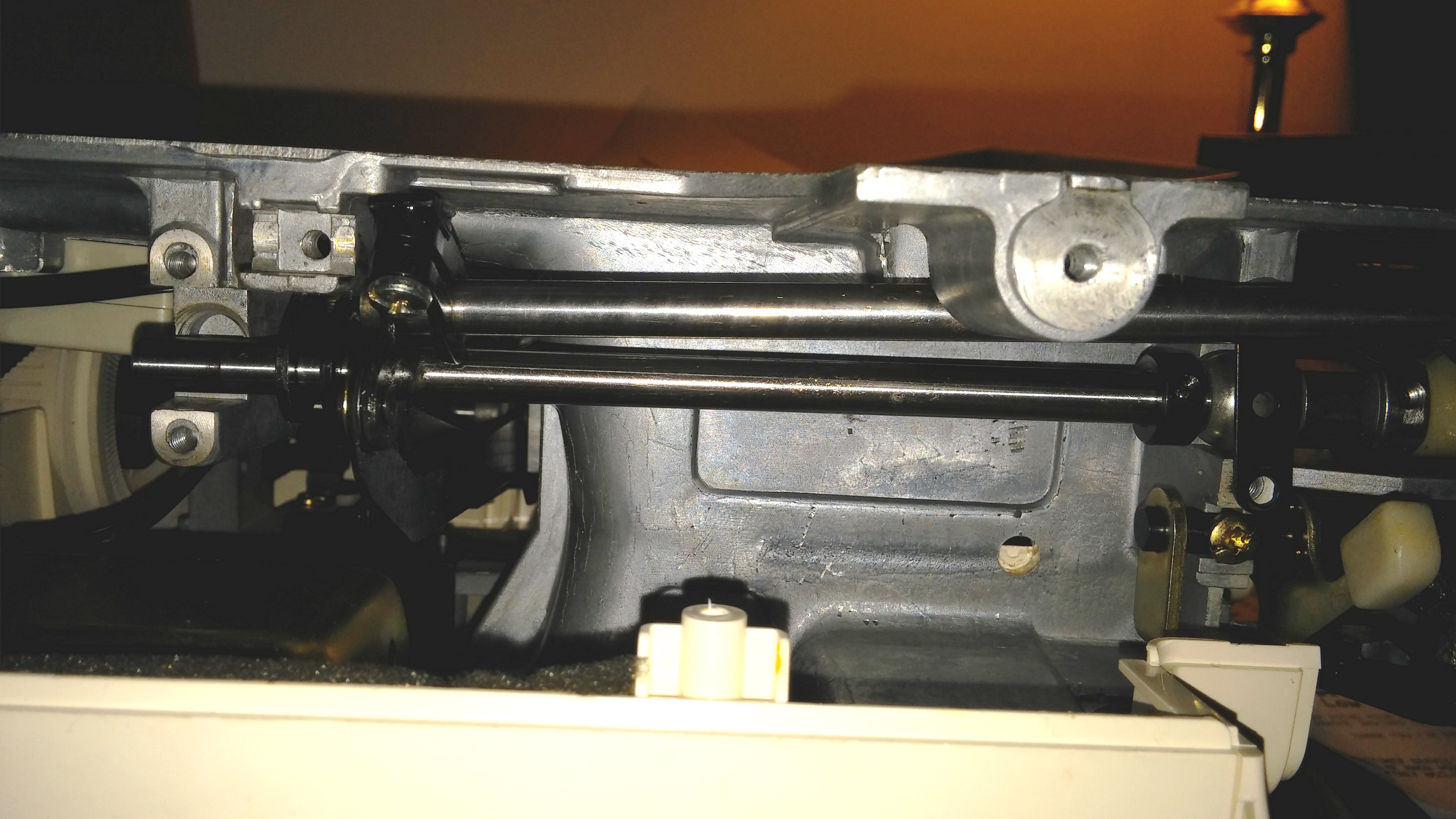 A few months ago, when my wife was sewing something, the machine began to jam. It turns out that one of the plastic gears had been eaten up pretty bad by a metal one. So I went to repair it. After all, I bought the machine for $5 at a garage sale, and the repair was still much less than buying another one.