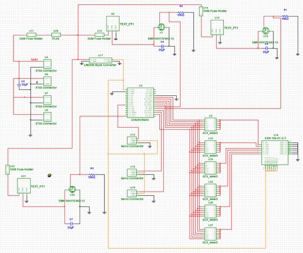 Nearly every schematic symbol and layout footprint is custom designed. While this is not standard practice, in this case it was done to carefully manage the component database for use by the student team. This way, silkscreen identifiers can be used to ease assembly of both the schematic and final, physical board.