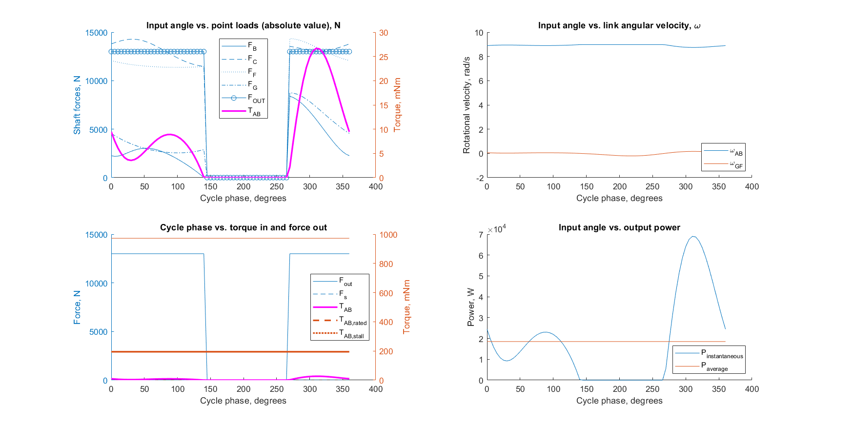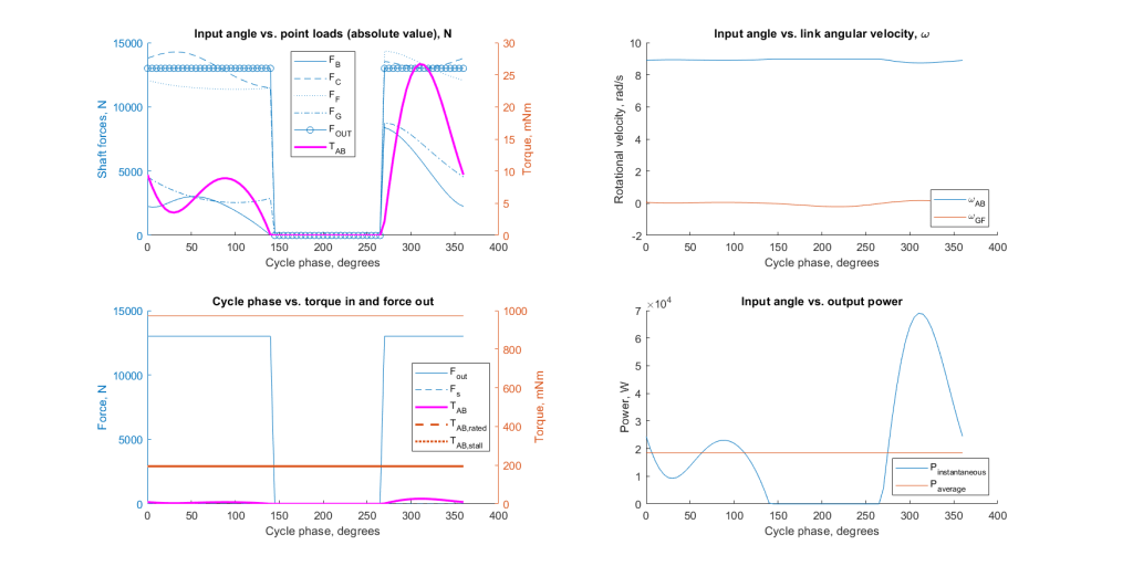 (Top left) It’s easy to see the double-toggle action in the predicted force curve, shown in the top left. (Top right) the rotational speed of the input shaft is quite high compared to the speed of the moving jaw, which bounces around 0, corresponding with an extremely high mechanical advantage. (Bottom left) the torque requirements change over time, but still fall within the motor operational specs. (Bottom right) the predicted instantaneous power curve also shows the double toggle action, and the average power (neglecting losses) matches the expected value.