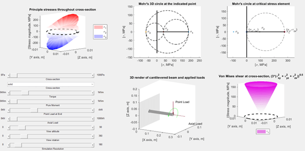 The solver allows users to adjust the types of applied loads, see the relative magnitude of those loads on a rendered cantilevered beam, and then see the calculated stress state at the point of maximum stress. To illustrate how Mohr’s circle works, the 3D Mohr’s circle is also plotted for the point of maximum stress and an arbitrary point elsewhere in the cross-section.