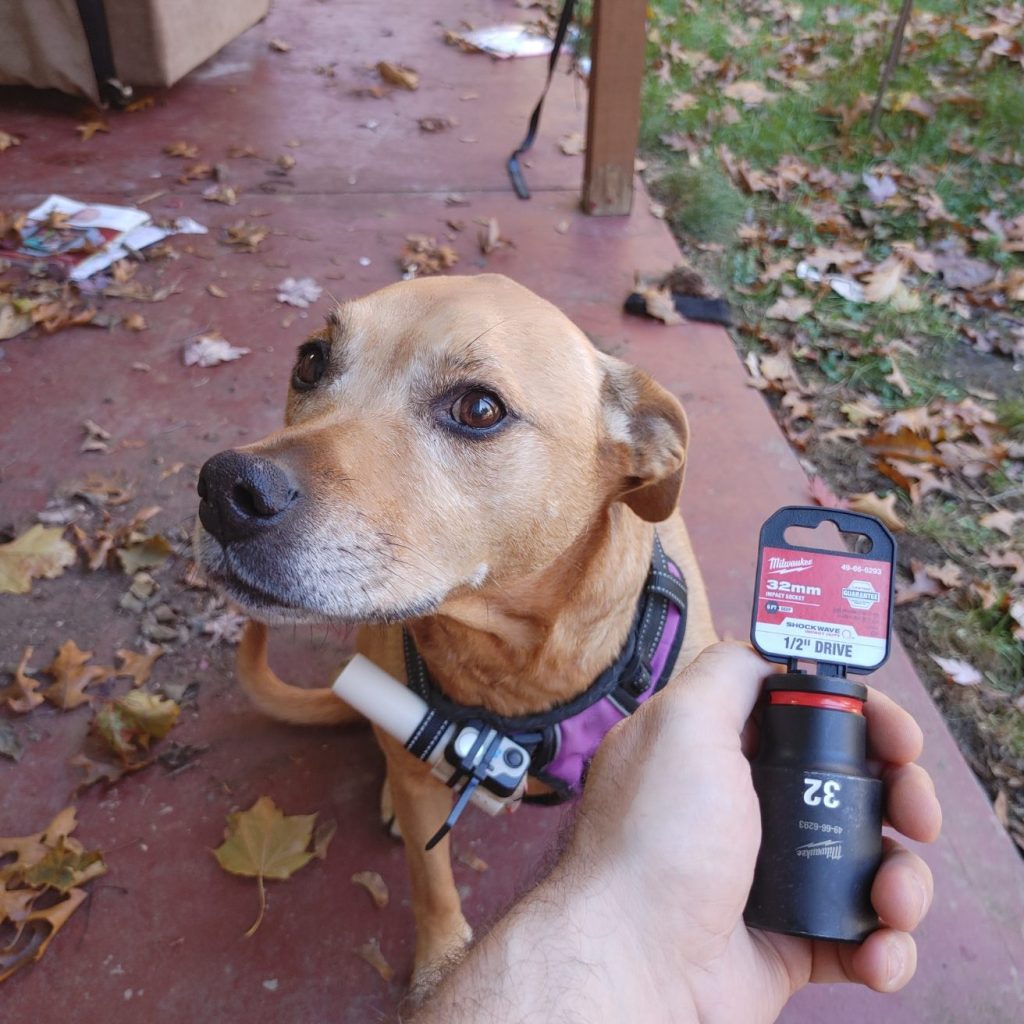 Dandy, shown modeling her new 32mm impact driver socket, is a rottweiler mix. Her father was a mutt of unknown mix. She is about 12 years old at time of publication.